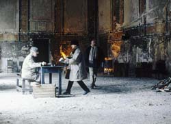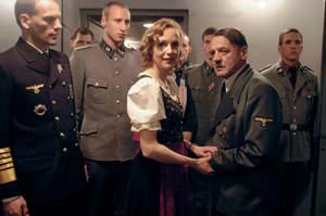 The German film Downfall chronicles the last days of Adolf Hitler. It is first and foremost a war film, and the production values are surprisingly high for a European work. Unlike most American war films, however, the ride is downhill all the way. Among the protagonists we find plenty of belligerent SS types, though as the city collapses, one or two individuals within the mix exhibit glimmers of conscience and common sense. Hitler himself, played by Bruno Ganz with remarkable aplomb, comes across as a gruesomely charismatic dreamer whom many of his subordinates have come to distrust profoundly. Within the depths of the bunker where Hitler is formulating his final set of plans for world conquest, (as the Russians approach the city from several directions), there are also quite a few secretaries, cooks, and orderlies, many of them quite agreeable people who nevertheless seem to believe sincerely in the future of their nation and the nobility of their Fuhrer. Some have asked why such enormous effort should be lavished on so devilish a story, yet Downfall is worth watching simply for the vivid picture it draws of the demise of a wretched ideal. But beyond that, the film reminds us that Hitler was a human being who put his pants on one leg at a time, just like everyone else. It fleshes out the curious and ungodly mix of bravery, dedication, religious fervor, misplaced loyalty, and bad thinking that led to the deaths of 50 million people. Although the Nazis cultivated that mix with a fervor that may never be surpassed, they didn't invent it and they didn't exhaust its potential either. Downfall reminds us that ideas can be very powerful, even when they're extremely wrongheaded. As a war film it is unique, and it will undoubtedly become a classic. 3 Whatever else may be said about him, it remains true that Jen-Luc Godard loves cinema with both passion and naivete. The “magic” of the big screen is something that he has clearly never outgrown. Notre Musique is the latest in a series of film essays that explore a particular concept—war, in this case—and as we watch it we become engrossed in the unfolding of an exposition that is both thought-provoking and visually intriguing, while remaining logically oblique. The film is patterned on the Divine Comedy —Hell, Purgatory, Heaven—but the structure is convenient rather than meaningful. Hell, which lasts only ten minutes, consists of a barrage of war images drawn from both documentary footage and old Hollywood movies. It's a fascinating and beautiful montage, which may get us to thinking about both the senselessness of such destruction, and its deep-seated allure.