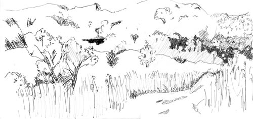 I see two kinds of grass across the way—a taller wheat-type and a shorter cattail type. I should know the names but I don’t. Then the bank of sumac, which I ignored in my drawing. Down in the valley some rather misshapen ash and also an elm, I think, to judge from the branching structure. You can see a few junipers out in the field, too, looking like black splashes. The woods in the distance are tough, I lack the proper technique to stylize them effectively.
