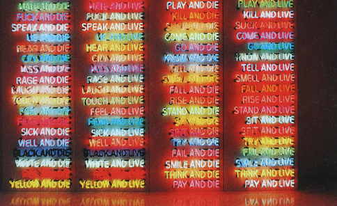 She explained to me that we’d gone the wrong way, up into the “performance tower.” The art was over to the right, down the hall toward the old Walker. For the record, this information is contained on the map, but it’s in an inner fold that Hilary only discovered during our drive home after the visit. Wouldn’t it be better to have a big Bruce Nauman neon sign with an arrow pointing the way? It could flash “Art” and then counterflash “Die.”