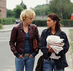 Will Marcela wait for her handsome, violent jailbird husband (played by Roman Luknar, who looks like a youthful Gerard Depardeau with features toned down and regularized.) Or will she fall for the suave gray-haired man who could give her almost everything, and also insure a secure future for her children? The question that's never raised, much less answered, is why Benes, who must have a wide array of sophisticated friends, and doesn't seem to be on the make, would be spending time with an airhead telephone reservationist at an airline who has two young kids and mixes her Chianti with Coca-cola. There is no real chemistry between the two, and we must conclude that Evzen is there merely to further the plot. It's not only the main character, but also the film itself, that's “beauty in trouble.” It's an elegant but highly schematic production, and what saves it is not the allure of its "beauty" or either leading man, but the charm of the film's least didactic and most interesting characters—the two little kids The Edge of Heaven I don't think they've come up with a name for it yet. Or if they have, I haven't heard of it. I'm referring to that type of film in which a number of stories take place simultaneously, most of which intersect, though often only tangentially and superficially. At times the consequences of such passing interactions be profound, of course. (That's usually a part of the message.) Robert Altman's Nashville and Short Cuts ; Keislowski's chromatic trilogy Red , White , and Blue ; Alejandro González Iñárritu's Babel . Crash . Magnolia . Pulp Fiction . Love Actually . The list goes on and on. In fact, all the way back to Grand Hotel (1932). It seems to me that quite a few of the films I've mentioned above—shall we call them “propinquity films?”—are better than average. This may be because only a seasoned and confident director would attempt to breathe life into such a diffuse format. Or perhaps it's because what has been lost to focus and the “narrative arc” is more than compensated for by the fact that lives fleshed out in brief images and clues are more mysterious and suggestive than those that are build block by block to form a coherent but predictable whole. And in the end, there is more than a grain of truth in the corny metaphysical notion that our actions affect the lives of others, and take on gravity and meaning, in ways that we neither intend nor fully understand. In “propinquity films” we see between the lines—we see things the characters themselves only dimly see.