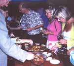 In time Hilary and Carol arrived, and after another trip through the food line we finally abandoned our choice spot near the feeding trough and went off to visit a few of the tables we’d previously overlooked. The hall was now teaming with men and women—young, middle-aged, old—many of them elegantly or flashily dressed for a night on the town. Eyes had long since begun to glisten and noise levels were rising to greater and greater heights. Though the servers behind the tables seemed to be holding up well, their gracious disquisitions on the merits of the Albariño grape and the rosy future of the Ribera del Duero region were growing a little stale through repitition.
