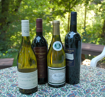 Among the whites, I find myself moving back and forth between the bland neutrality of cheap Italian whites and the cotton-candy tastes of cheap California Chardonnays. We buy the low-end white Burgundies—Macon-Village or simply Bourgoyne—hoping for a touch of distinction, often in vain. A move up to Macon-Vire or Les Setilles can sometimes be worthwhile.