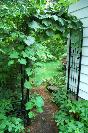 The great triumph of this gardening season has been the wrought iron arbor I bought recently to gather and make use of the wild grapes that thrive in the shade under the four Colorado blue spruce trees on the south east side of our yard. That portal is so handsome! Every time I walk through it I feel the freedom and ease of not having to brush aside all the vines and elderberry branches that used to crowd the path before I put that little archway in. It’s true, I don’t go that way very often, unless I’m pushing the lawn mower from the front yard to the back yard, in which case the magic of the moment is somewhat undercut by the loud noise of the machinery and the sensation of dead, dry pine needles flying at great speed against my unprotected ankles. All the same, I love that arch.