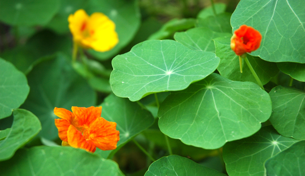 But make no mistake. The plants we cultivate and enjoy may become our friends, but they stand somewhat removed from us. Like us, they have elevated themselves considerably above the random molecular activity of the interstellar regions. Yet their habits, forms, and colors continue to startle and impress us, because we see in their visage creative achievements that we could never conceive of on our own, and will never match. The irregular pattern of a single nasturtium leaf, with its spoke-like ribs, may, on occasion, fill us with a child-like joy. As for the tender tissue of soft orange flower hiding underneath, it can sometimes be almost shocking in its sensual appeal.